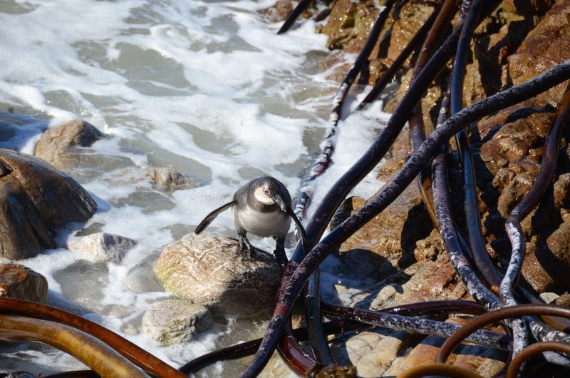 On the way to Hermanus we stopped at a beach along Gordon's Bay with big waves and an abundance of beach-combing opportunities. We collected natural sea sponges, beautifully shaped driftwood, and hundreds of sea shells. Just past Gordon's Bay we stumbled across another mainland colony of African Penguins at Stony Point in Betty's Bay. This colony is not well posted but is far bigger and more natural than the penguins at Boulders Beach at Simonstown. The area is quite large and the nests cover the entire area, some under the natural bush and some in "caves", some just seem to be totally unprotected and in the open. Watching the penguins make their way across land is a treat as they are very comical. The leaving and returning to land looks very difficult with the waves swirling the penguins around and onto the rocks and the giant ropes of seaweed creating barriers all around them - but the penguins seem to take it all in stride.